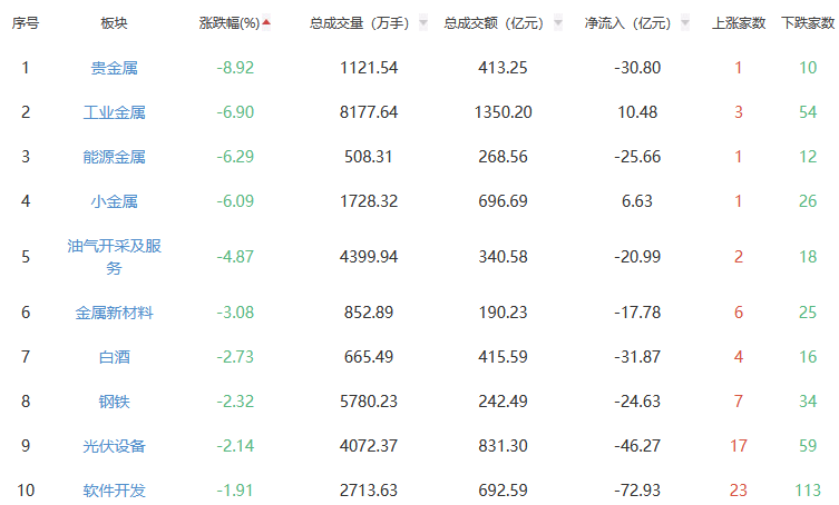 行业板块方面,种植业与林业、造纸、影视院线等板块涨幅居前,贵金属、工业金属、能源金属等板块跌幅居前。