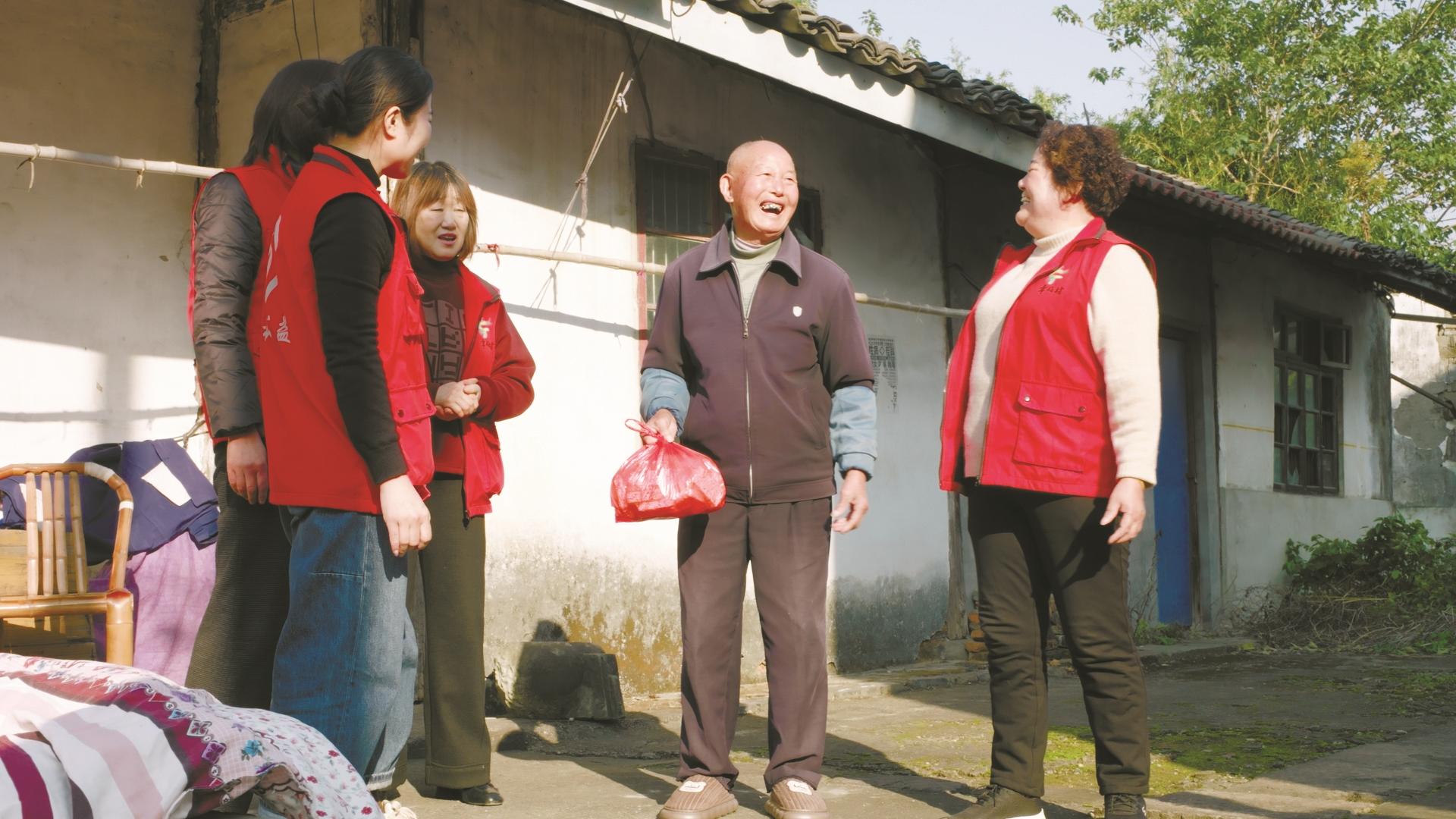 志愿者慰问老人。