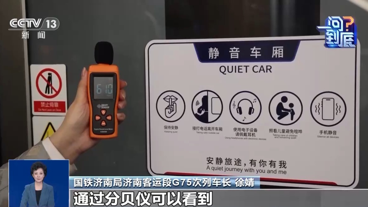 国铁济南局济南客运段G75次列车长 徐婧:静音车厢并非完全“无声”,而是将噪声控制在不影响他人范围内,通过分贝仪可以看到,在列车运行中,“静音车厢”的环境音量为65分贝左右,相当于日常轻声说话的音量。而普通车厢同等状态下,环境音量为80分贝左右,相当于日常大声说话或热闹办公室的音量,两者相差了15分贝,安静度差异十分显著。