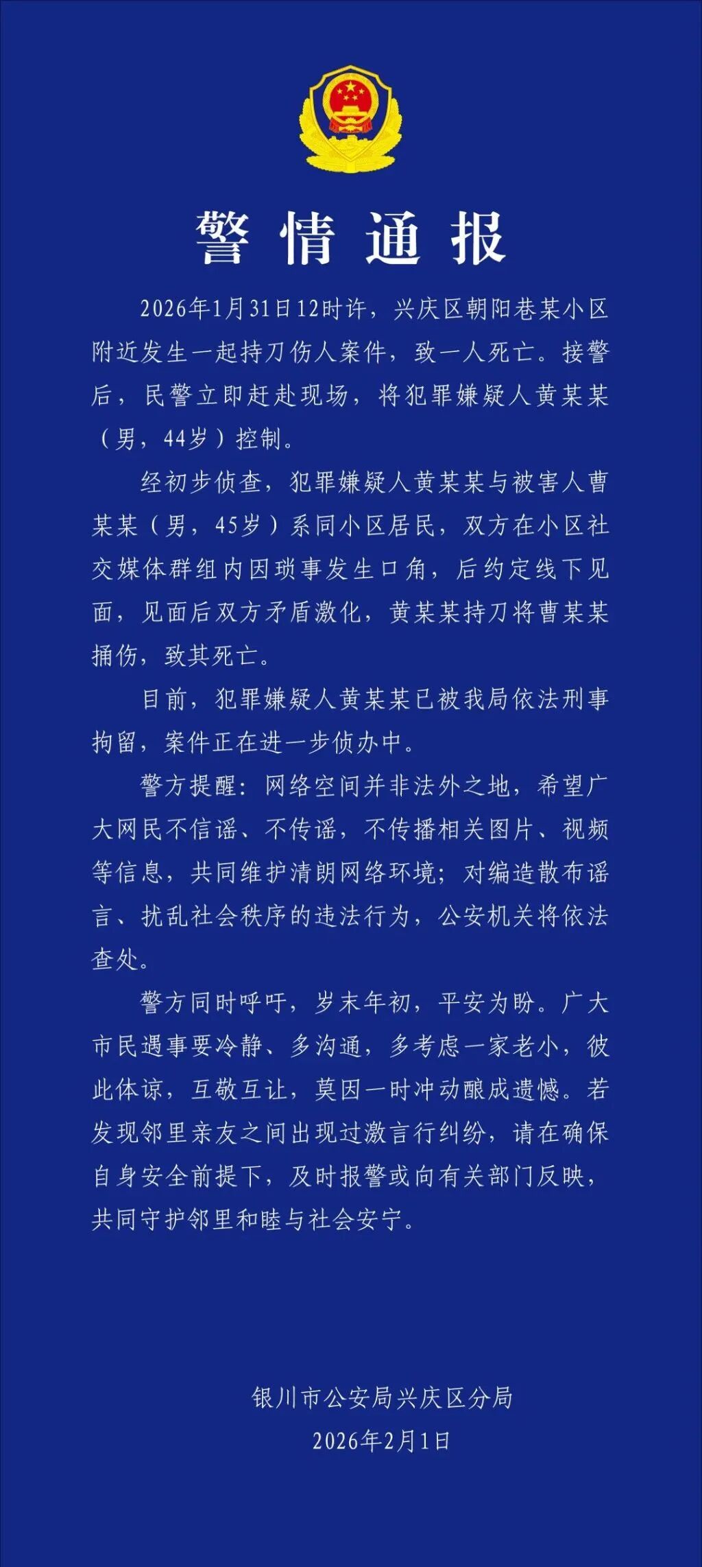 2月1日,宁夏银川市公安局兴庆区分局发布警情通报: