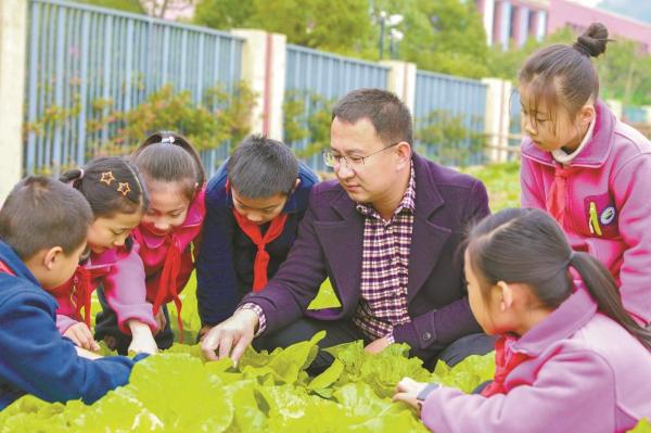 余经科老师带学生观察蔬菜生长情况。图片均由通讯员提供
