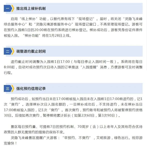 1月26日,杭州西湖风景名胜区灵隐管理处发布关于优化杭州灵隐飞来峰景区预约机制的通告:为进一步优化杭州灵隐飞来峰景区公共资源分配,解决预约过程中游客反映的问题,提升游览体验,景区决定自2026年2月1日起,对现行的预约机制进行优化升级,全新推出“线上候补”功能,并对预约规则进行优化调整。相关优化措施如下: