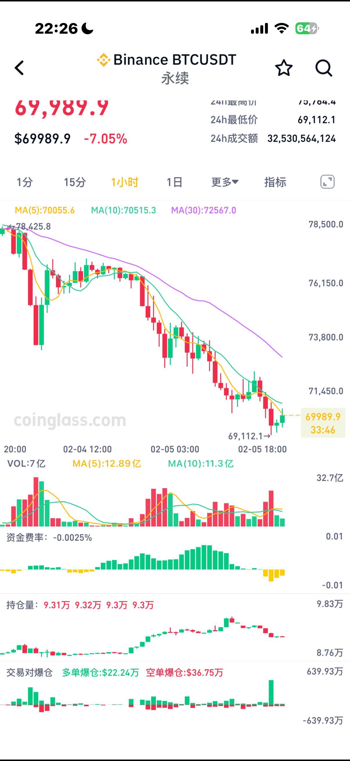 比特币目前报69982美元,下跌7.03%,也是2024年11月5日以来首次跌破7万美元。