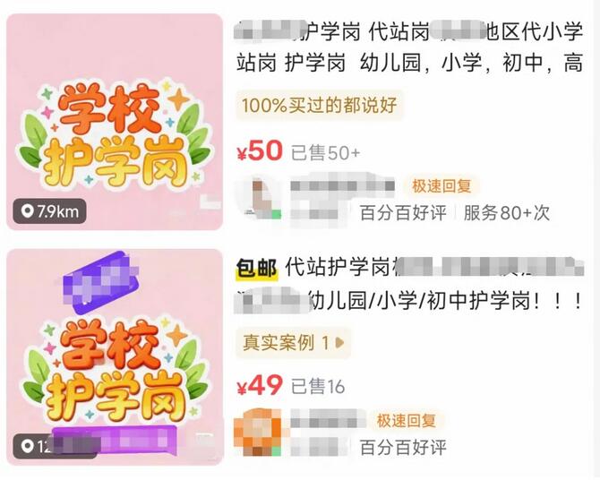 闺蜜一下子打开了张女士的思路,她试着一搜“代护学岗”,居然跳出了好多卖家,收费一般在50元/次。有专门针对某个区域的,也有不限区域的。张女士选了一家成交量较高的卖家,卖家表示,这个服务她已经提供了一年多了,有些家长都成了“回头客”。