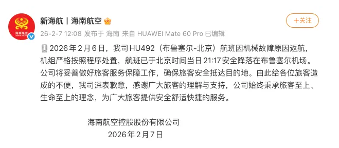 2月7日午间,海南航空在官方微博发文就此事致歉:2月6日,我司HU492(布鲁塞尔-北京)航班因机械故障原因返航,机组严格按照程序处置,航班已于北京时间当日21时17分安全降落在布鲁塞尔机场。