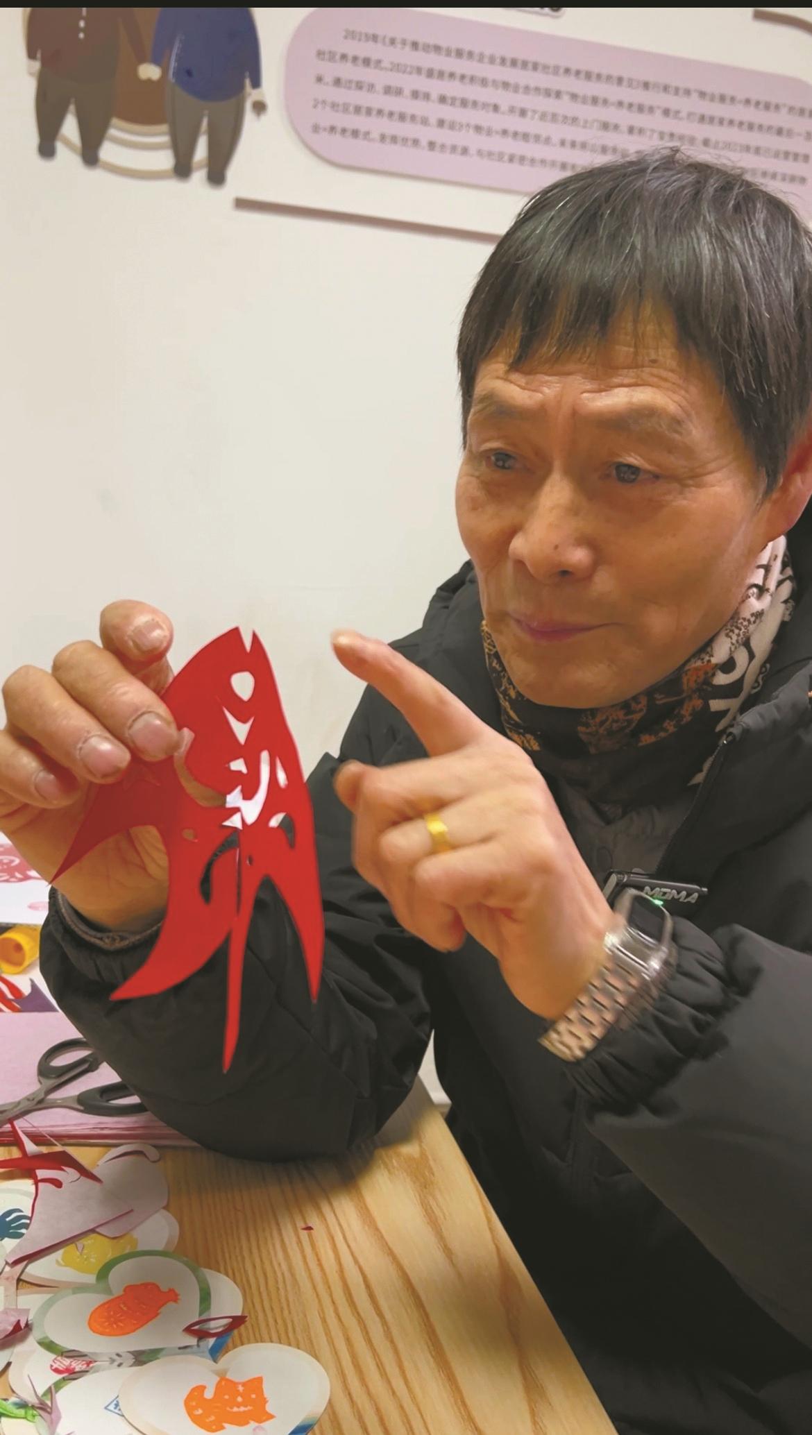 鼎天物业经理曹颖颖笑着为大家揭开谜底,这位特殊的秩序员名叫陈士海,他的另一个身份是镇海区非遗剪纸代表性传承人、镇海区遇“剪”白龙非遗工作室负责人。“眼看小年就要到了,我们特地组织了这场剪纸写对联的送福活动,请来陈师傅现场露一手,为业主送上一份独一无二带着烟火气的小年祝福。”