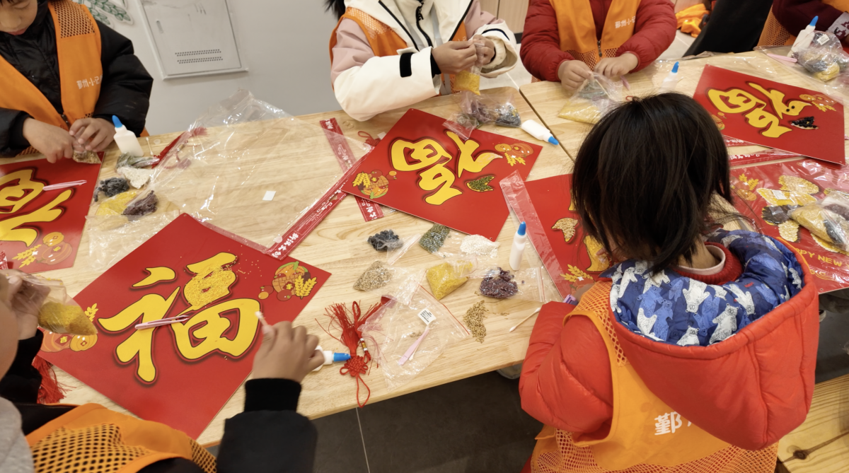 孩子们围着做五谷“福”字。