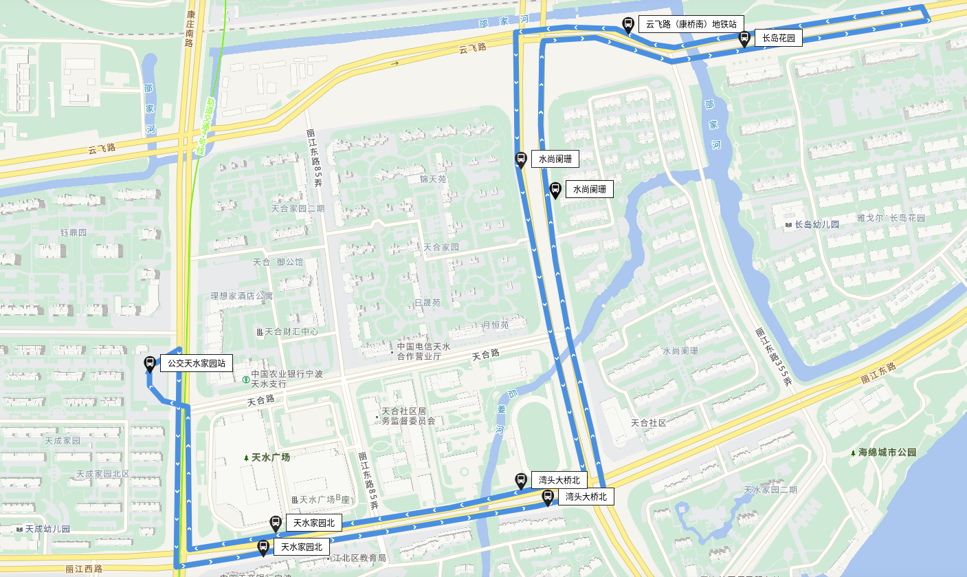 站点设置:公交天水家园站、天水家园北(丽江路地铁站)、湾头大桥北、水尚阑珊【云飞路(康桥南)地铁站】、长岛花园(注:位于云飞路)、云飞路(康桥南)地铁站、水尚阑珊【云飞路(康桥南)地铁站】、湾头大桥北、天水家园北(丽江路地铁站)、公交天水家园站。