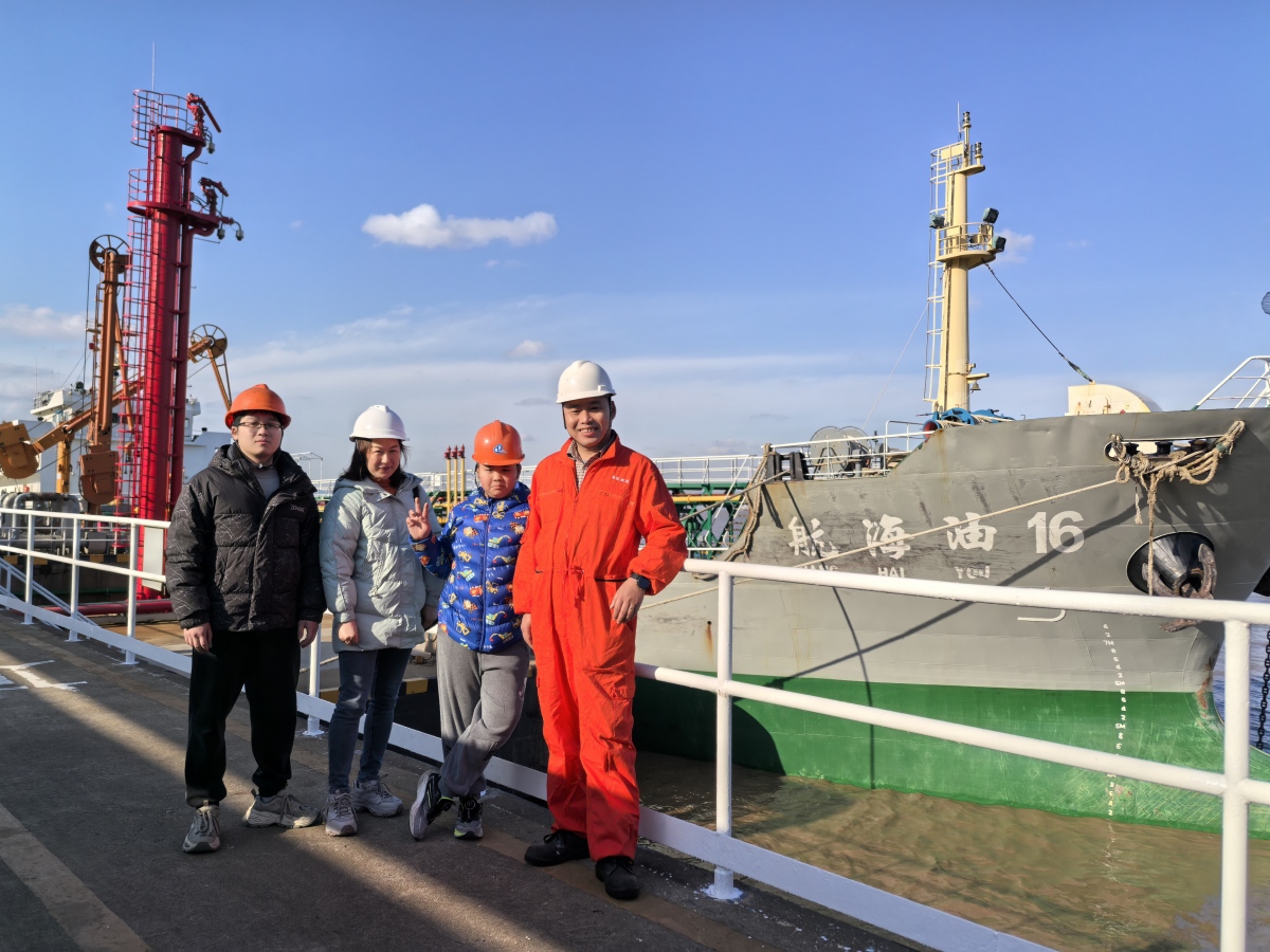 陈建中一家与“航海油16”轮合影。林昱辰 摄