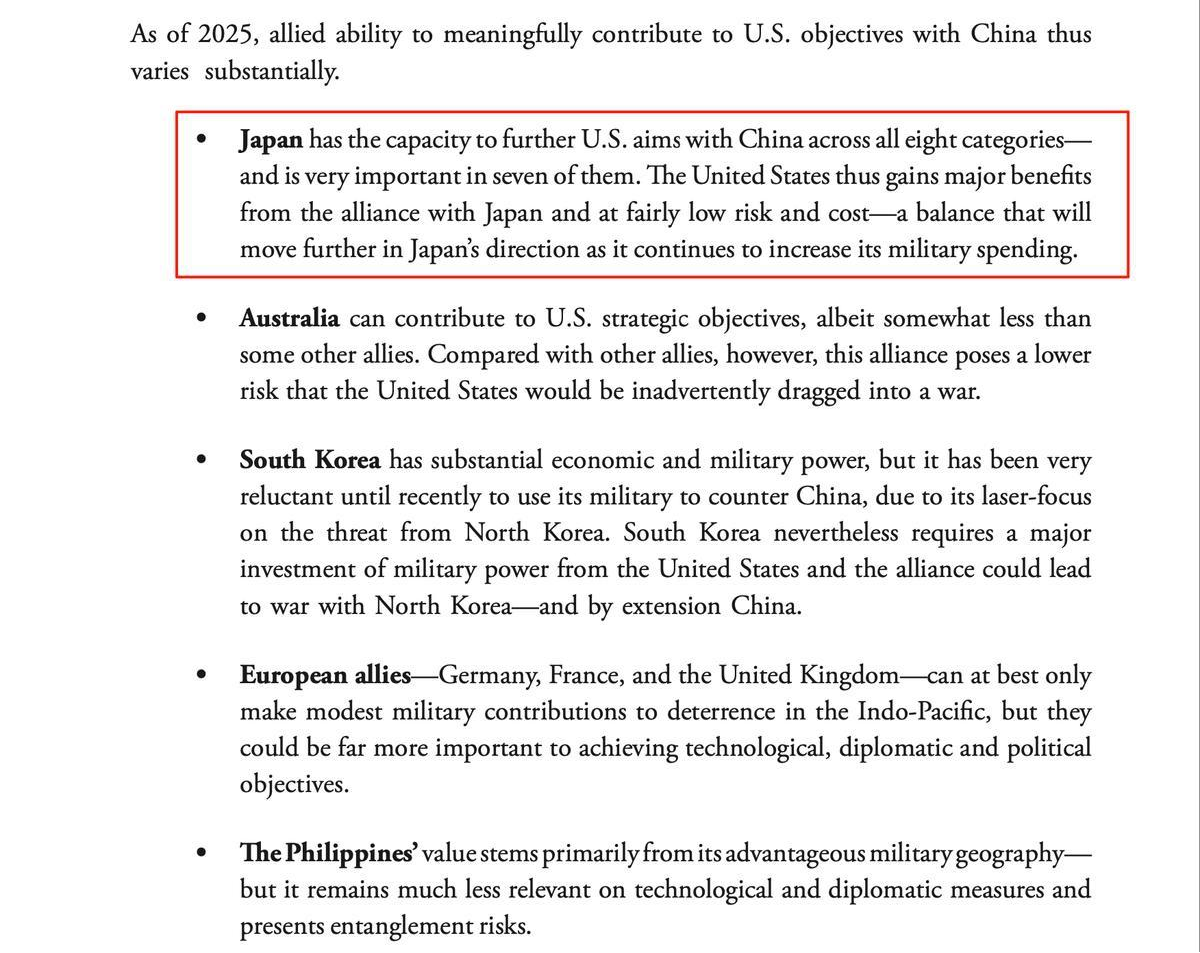 此番大选前夕,特朗普的高调支持,让某些日本政客欣喜若狂,以为找到对抗中国的靠山。但明眼人都知道,特朗普词典里从没有“慷慨相助”,美国的支持背后早就标好了价格。此前美国智库曾发布过一份“评估美国盟友在对华竞争中的作用”的报告,以与中国战略竞争八大领域贡献值为标尺,对英法德澳日韩菲七个盟友进行排序,日本赫然居于榜首——在特朗普眼中,想在亚太制衡中国,日本正是最具利用价值的“战略资产”。支持高市早苗上台,不过是为了将日本牢牢锁进美国的战车。