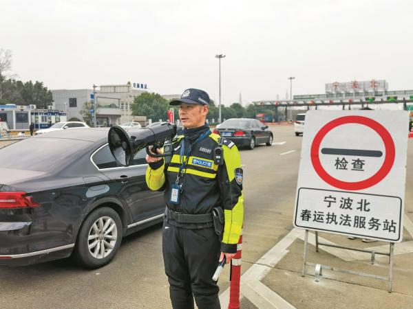 江北交警在宁波北高速出入口执勤。(王晓峰/摄)
