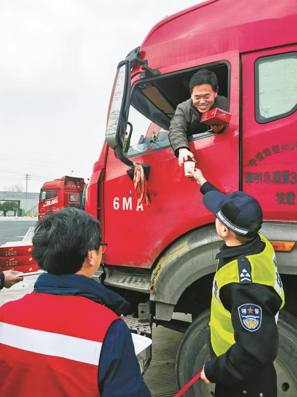 交警给货车驾驶员送上小礼物,祝其一路顺风。(王晓峰/摄)