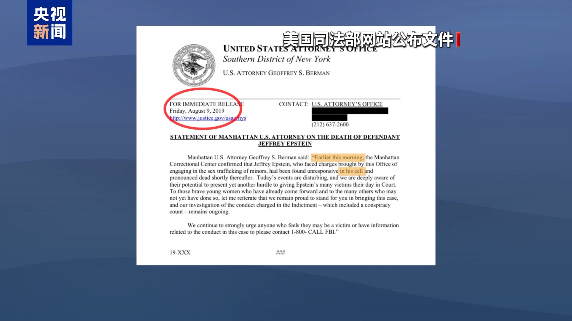 此外,有消息显示,上月底公布的文件中,还有美国纽约南区联邦检察官办公室的死亡声明草稿,内容是爱泼斯坦于“今天早间”“在其牢房中”身亡,日期赫然写着“2019年8月9日”,也就是爱泼斯坦死亡的前一天。与后来公布的正式声明不同,这个“早产”的声明草稿没有提及“疑似自杀”的字样,仅模糊表述为爱泼斯坦“不省人事,随后被宣告死亡”。