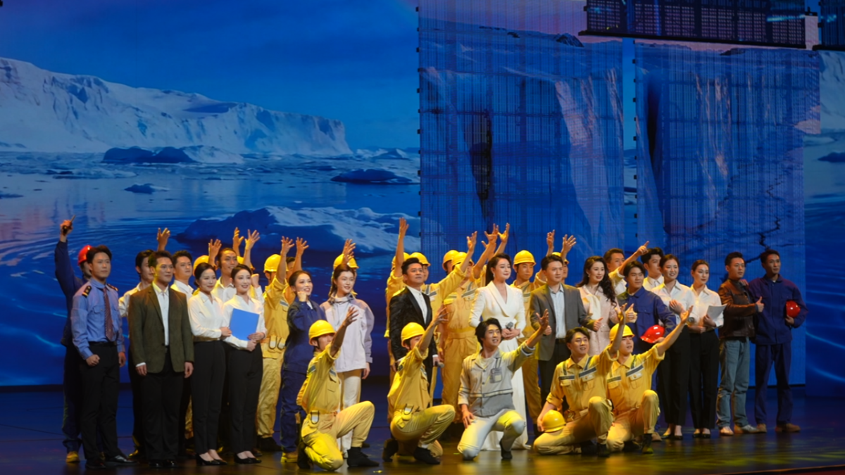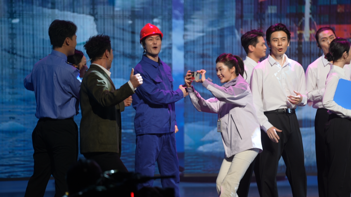 舞蹈演员化身“北极海豚”,在光影中腾跃翻腾,与大屏幕上的冰川、浮冰精准相融,生动再现了“伊斯坦布尔桥”轮穿越白令海峡、搏击极地风浪的艰险。