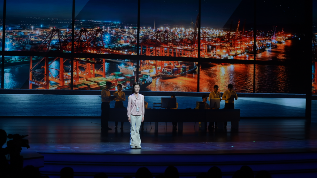 舞台上的“记者”再次走上台前,在激昂的音乐中说出:“就在9月23日凌晨,这艘名货轮满载着4890个集装箱整装待发”。
