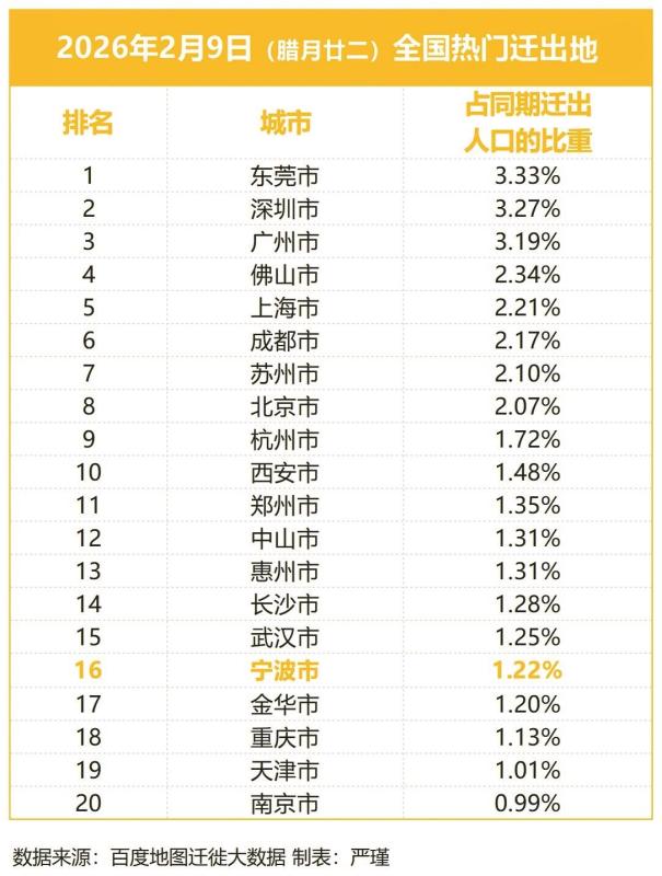从全国范围看,宁波在2026年春运期间再次跻身全国“TOP20”的热门迁出城市。以腊月廿二(2月9日)为例,宁波的迁出规模指数排在全国第16位,占同期全国迁出人口的1.22%。