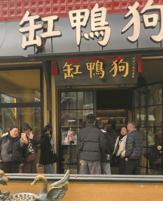 缸鸭狗天一广场店外,暮色渐深,三三两两的食客走进店内。一位带着孩子的母亲指着透明厨房里的师傅说:“看,汤圆是这样做出来的。”而不远处,甬上名灶等位区依然人头攒动,叫号声此起彼伏。