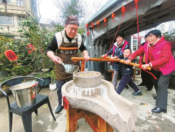 当居民大快朵颐时,集市体验区也好戏开锣。一侧,非物质文化遗产灰汁团制作技艺代表性传承人汪春味带着老人孩子体验石磨磨豆浆;另一侧,非物质文化遗产油赞子制作技艺代表性传承人董行培开启了搡年糕活动序幕。
