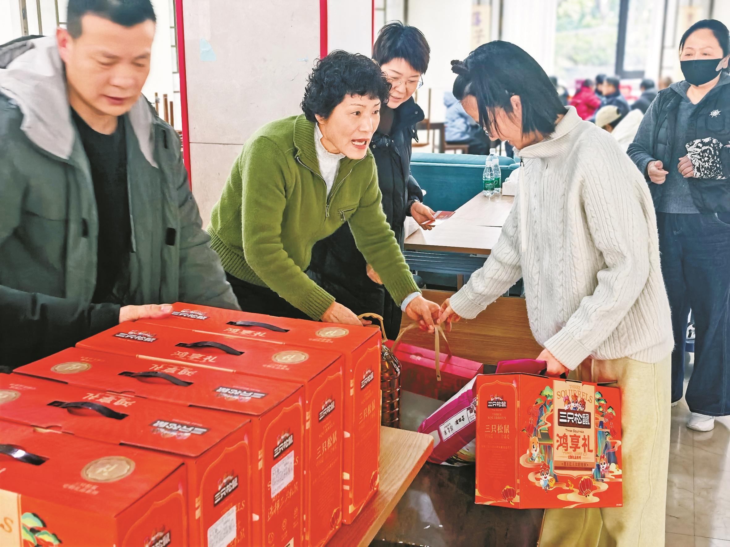 “今天领来年货了,年味越来越浓啦!”昨天下午,鄞州区潘火街道香园小区居民葛亚飞说。在香园小区一楼大厅,一份份红彤彤的年货礼包整齐堆放着,业主们手持提货券,有序排队领取这份“马年新春惊喜”。这是香园小区交付9年来首次举办的“年货节”,由业主自己为自己发放年货,2305户家庭可在春节前凭提货券免费领取。