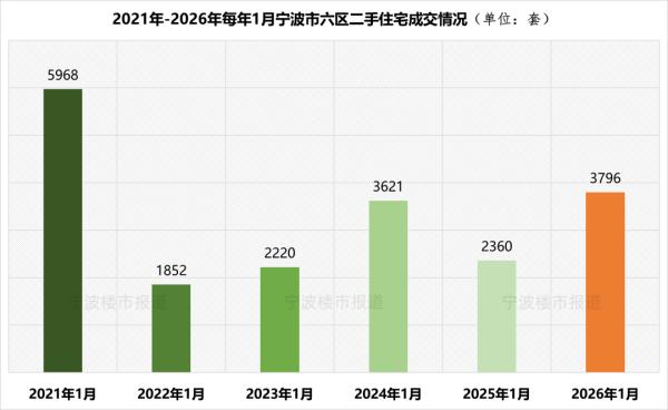 首先是一直被视作“楼市风向标”的二手住宅(以下简称“二手房”)市场,一月市六区共成交3796套,是自去年五月以来连续第9个月稳定在3000套以上水平,虽较去年翘尾收官的十二月环比微降1%,但在2021年4月宁波楼市进入本轮深度调整以来的历年一月中居最高位——