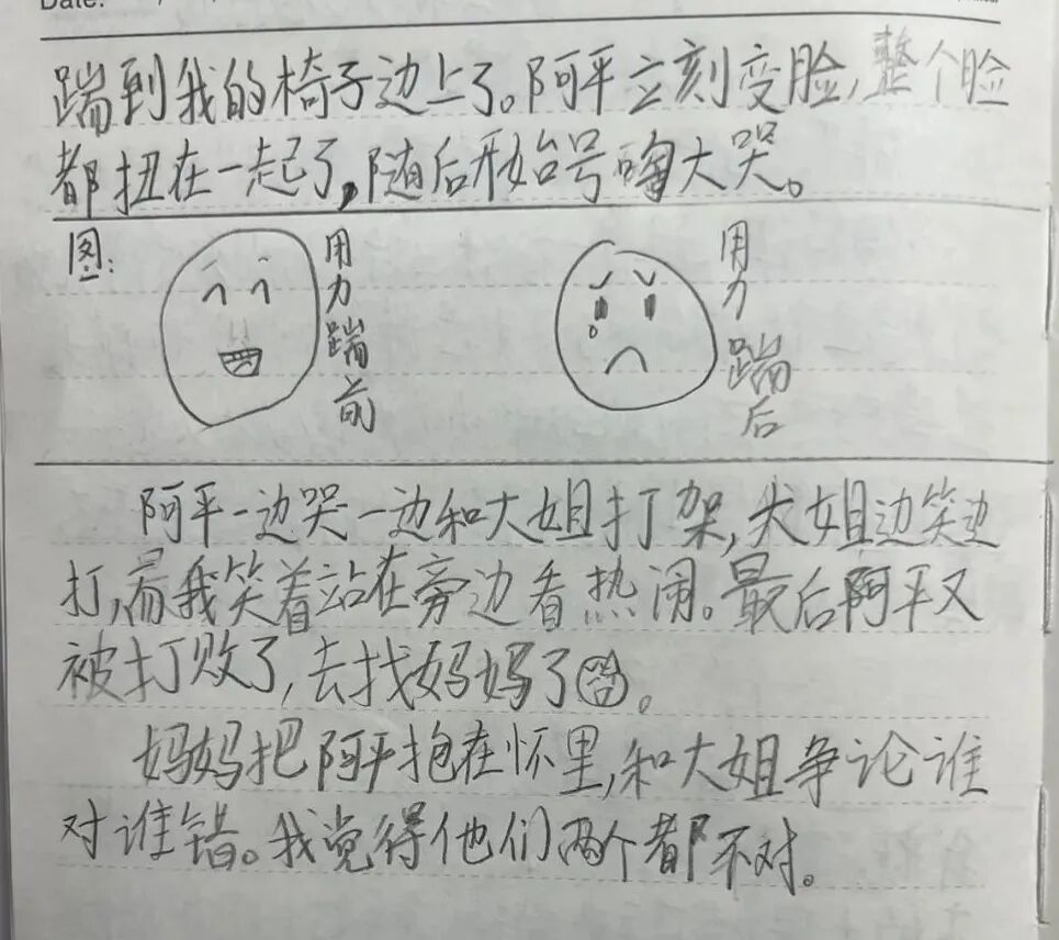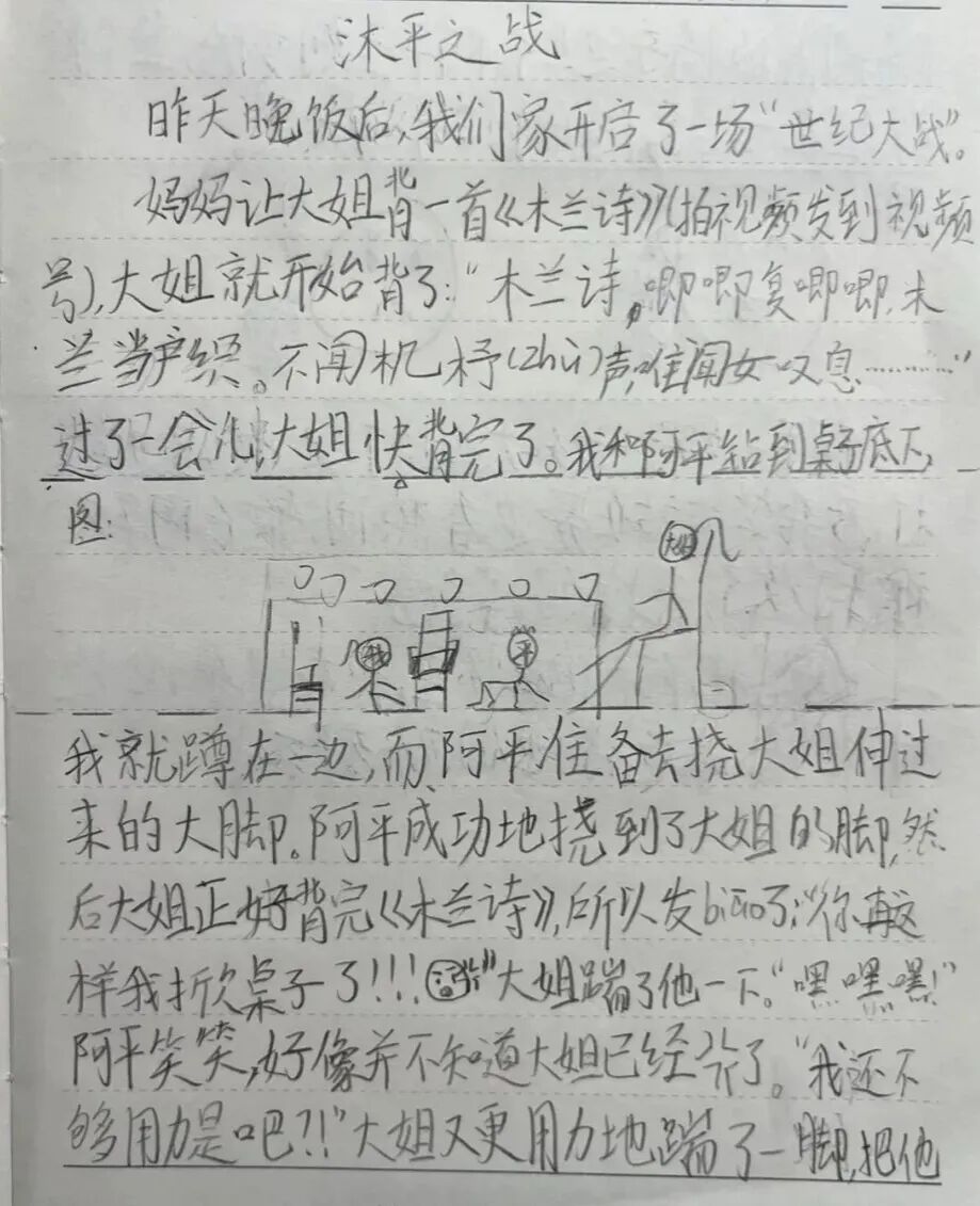 “妈妈让大姐背诵《木兰诗》准备拍视频,大姐流利地背了起来。而我和三弟阿平,则悄悄钻到了桌子底下……”日记里,可可这样写道。那天晚上,因为弟弟总挠大姐的腿干扰背诵,大姐在背完后“发怒了”。一场混战随即展开。