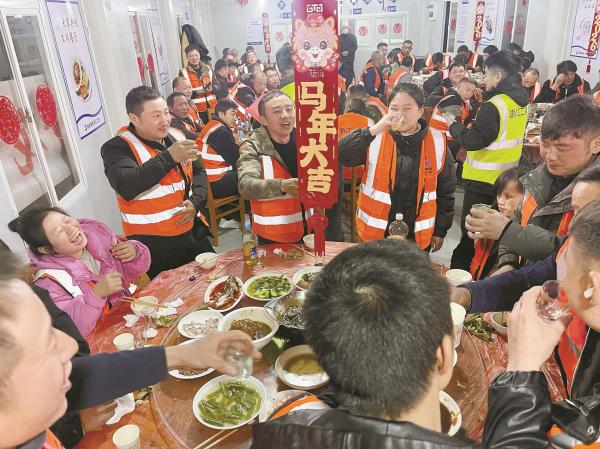 2月10日傍晚,年味已浓。镇海区综合体育中心项目工地上,依然一片忙碌。不过,当天的项目部处处透着幸福。浙江二建宁波分公司把“年夜饭”的桌子,直接搬进了工地。近百名留岗坚守的建设者,在这里吃上了一顿热闹的团圆饭。