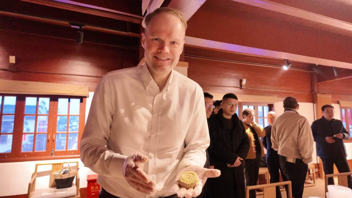 两个小时的座谈,没有人看表。最后一项议程是民俗体验——做龙凤金团。面点师傅把模具端上来时,金发碧眼的童安睿被大伙拱着率先体验。