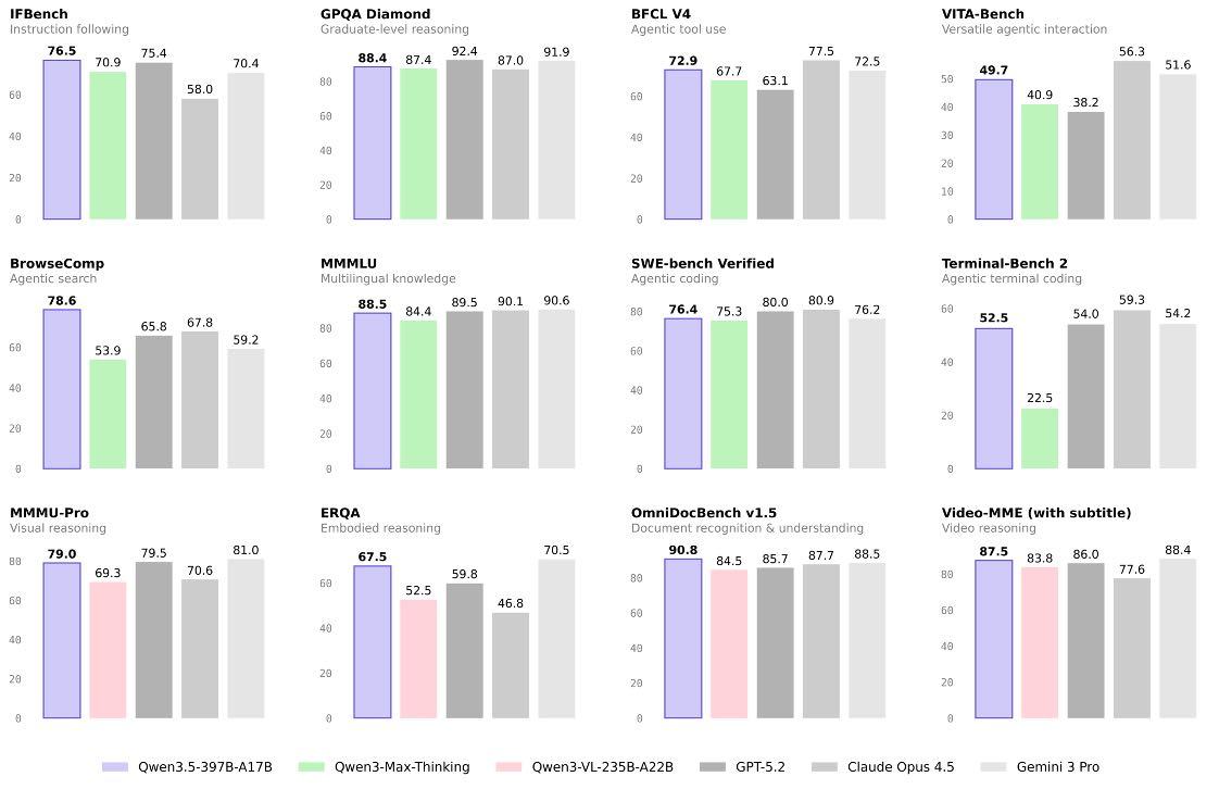 比如,千问3.5在MMLU-Pro知识推理评测中得分87.8分,超越GPT-5.2;在博士级难题GPQA测评中斩获88.4分,高于Claude 4.5;在指令遵循IFBench以76.5分刷新所有模型纪录;而在通用Agent评测BFCL-V4、搜索Agent评测Browsecomp等基准中,千问3.5表现均超越Gemini 3 Pro、GPT-5.2。