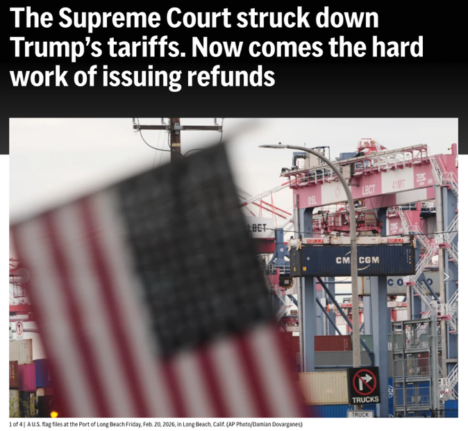 美联社报道,最高法院驳回特朗普的关税政策后,艰巨的退还税款任务开始了。图源:央视新闻
