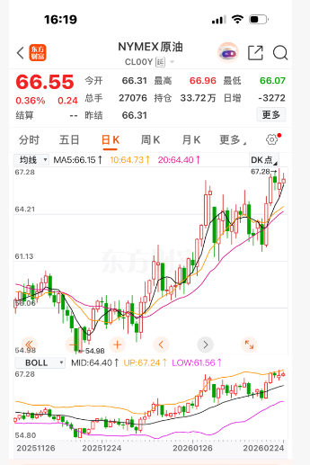 美国和伊朗之间目前正处于谈判和军事对峙并存的状态,中东的紧张局势是导致国际油价持续上涨的主要因素。其中布伦特原油期货价格已从年初的60美元左右/桶涨到70美元上方/桶,今年以来涨幅达到16%以上;纽约原油期货也从年初的60美元下方/桶涨到最高67美元以上/桶,今年以来涨幅15%以上。