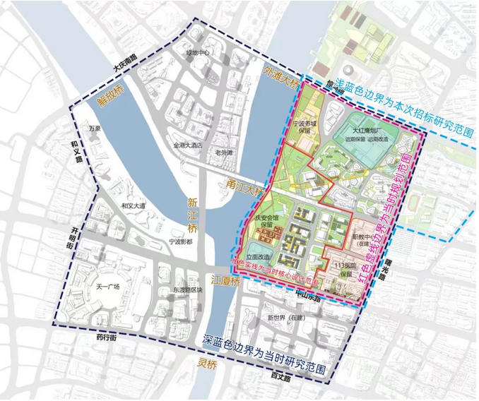 当时,庆安广场详细设计及建筑概念性方案征集设计的范围,分为研究范围、规划范围和核心设计范围3个层次。其中,规划范围内的宁波书城、113医院、庆安会馆、职教中心为保留区块,大红鹰卷烟厂明确近期保留、未来改造,金光中心区块明确进行立面改造。