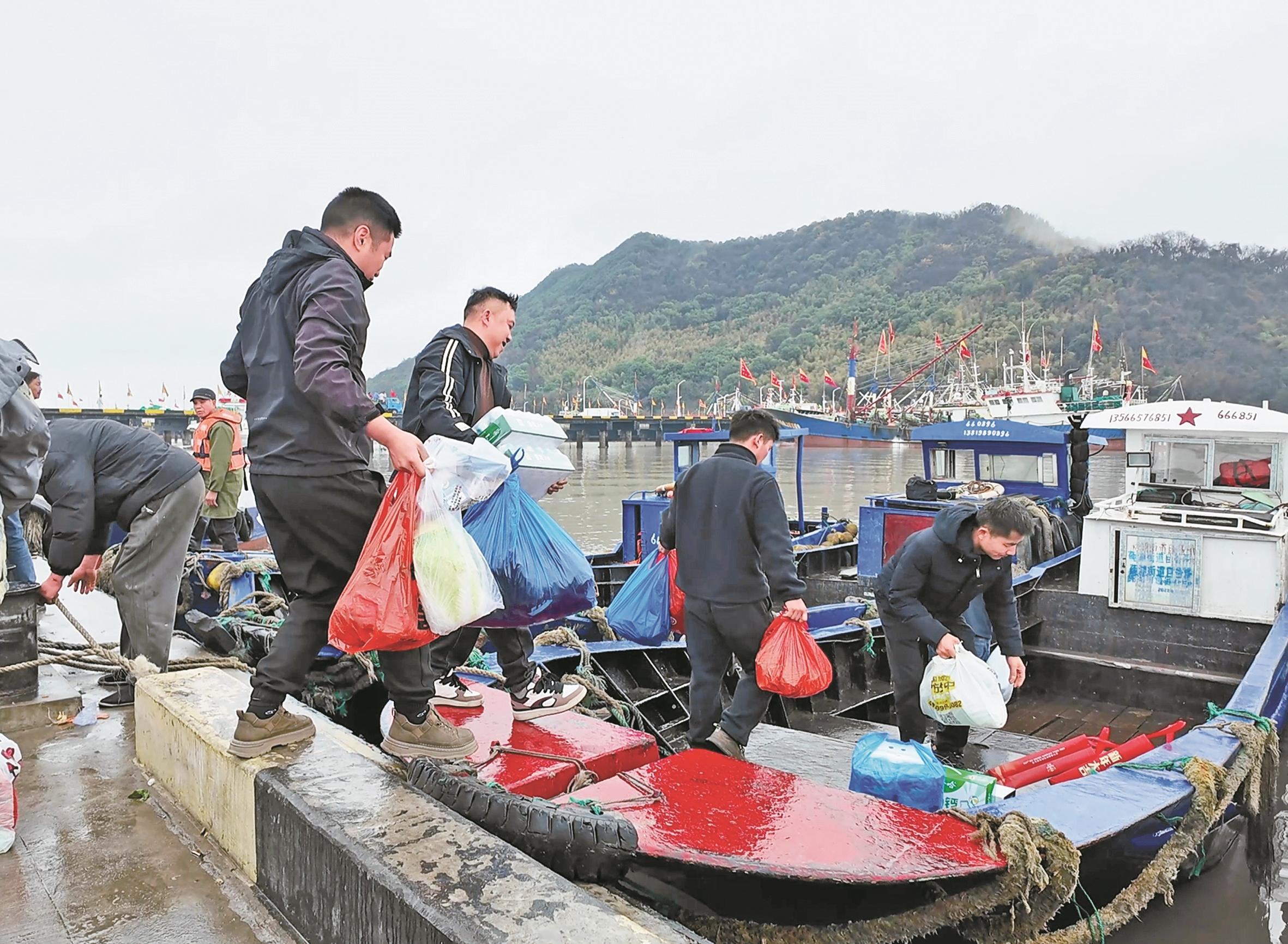 图为渔民在搬运物资。(甬派客户端宁波日报 陈章升 王林威 景士杰 摄)