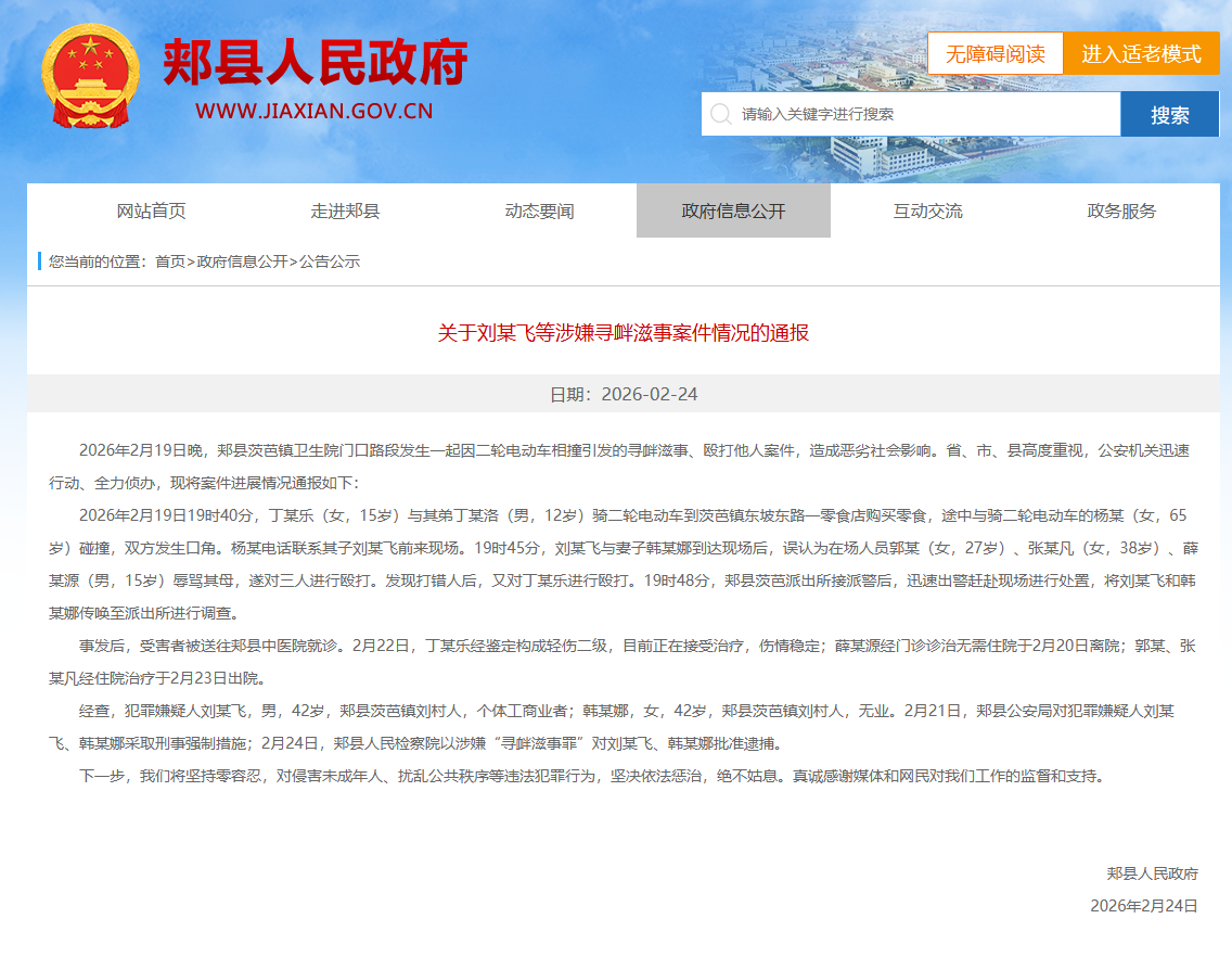 2026年2月19日晚,郏县茨芭镇卫生院门口路段发生一起因二轮电动车相撞引发的寻衅滋事、殴打他人案件,造成恶劣社会影响。省、市、县高度重视,公安机关迅速行动、全力侦办,现将案件进展情况通报如下: