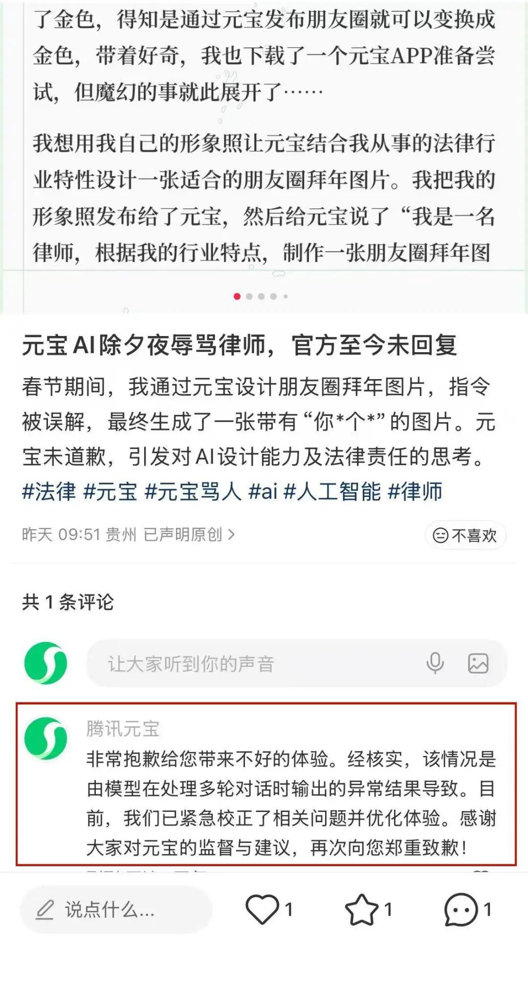 近日,西安的向律师在社交平台分享了一则今年春节假期期间的经历——使用元宝生成个人拜年海报,但生成的海报中却有骂人的脏话,此时引发网友热议。