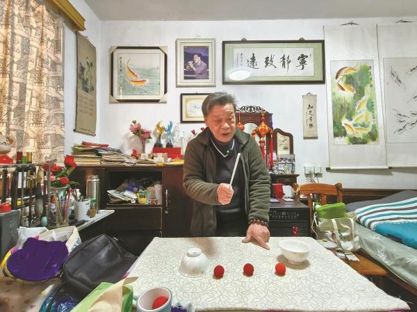 这位魔术师,正是社区居民口中最亲切的“魔法爷爷”王敬耀。他不仅会变80多种魔术,还有一副好嗓子,拉得一手好二胡,书法和国画更是坚持多年的爱好。