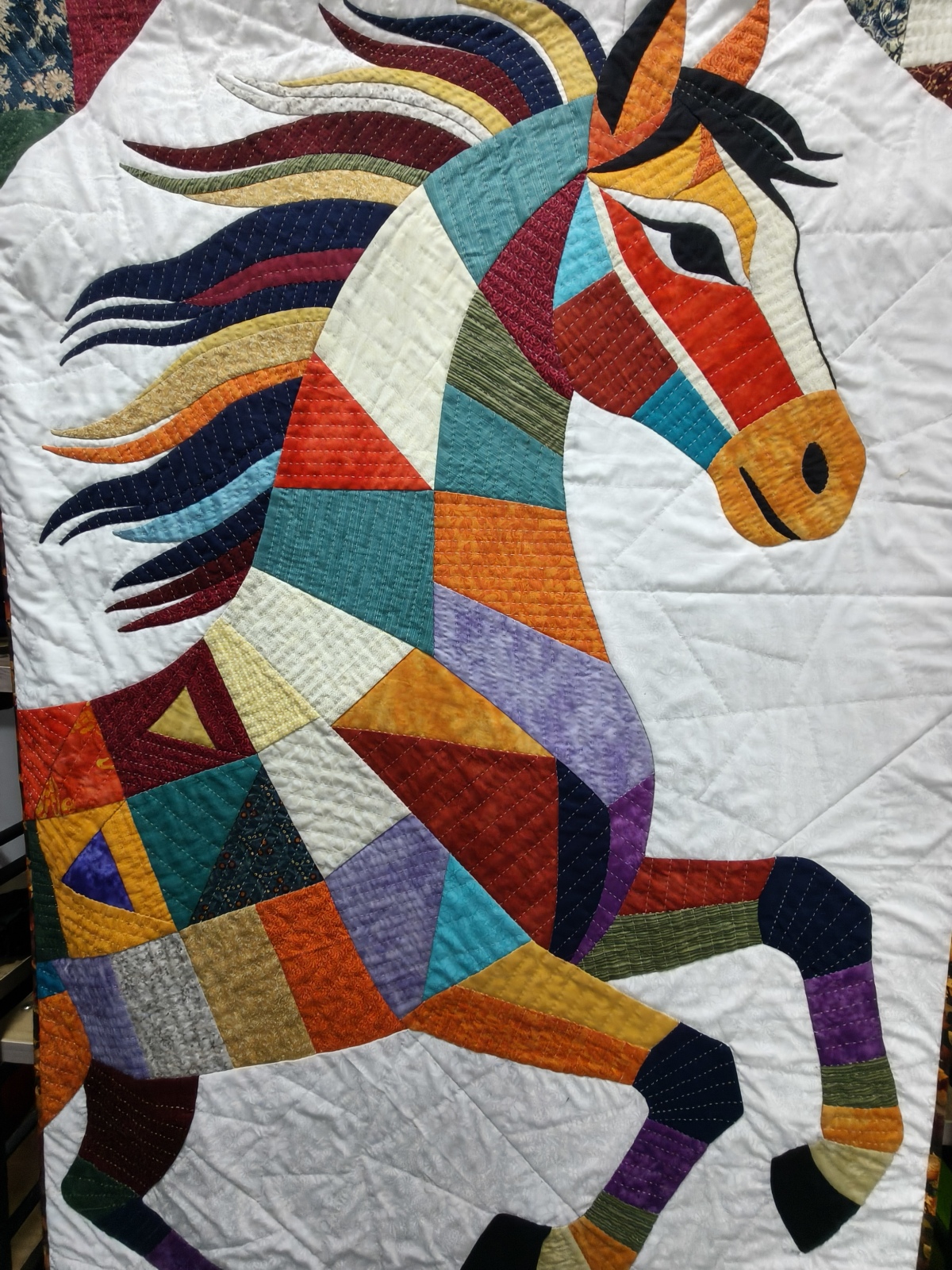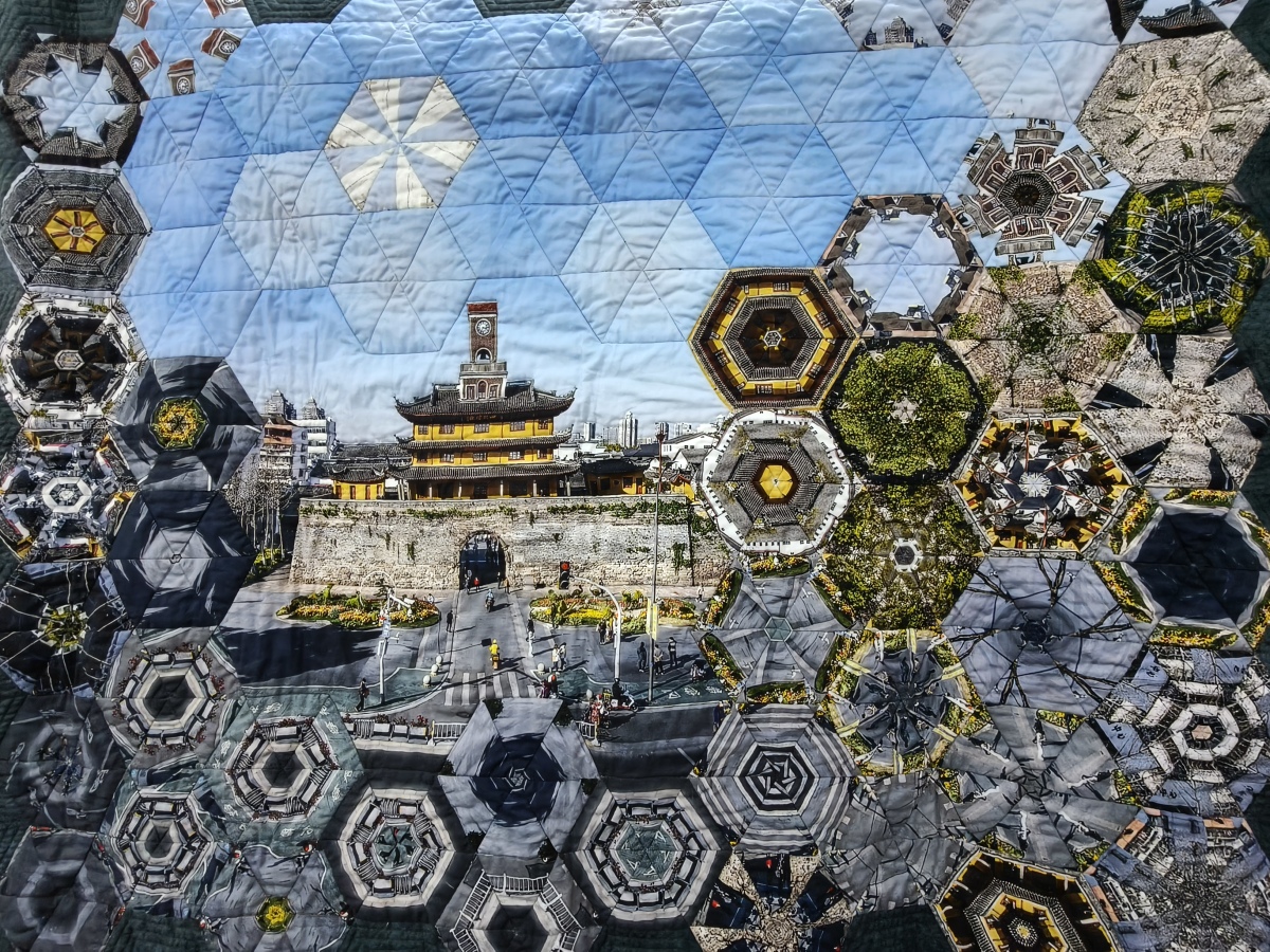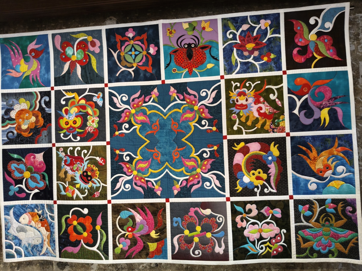 值得一提的是,馆内悬挂着一幅幅色彩绚丽、栩栩如生的挂画,以缝纫机为笔、以布料为墨,经裁剪、拼接、缝绣而成的。