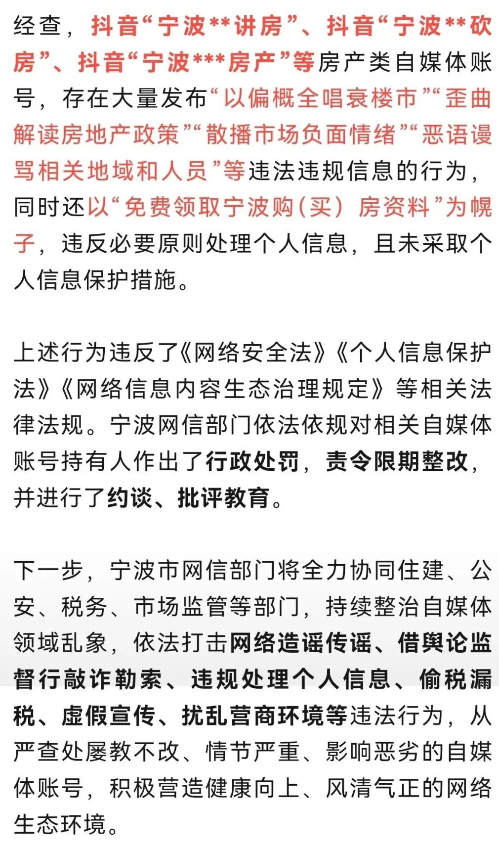 据宁波网信部门消息,近期,宁波市多部门联合开展房地产领域自媒体专项整治,集中查处了一批房产类自媒体违规账号,对账号持有人分级分类进行了处罚处置,全力促进宁波房地产市场健康有序发展。