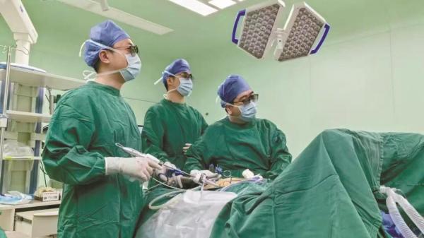 梁超(左)带领团队实施手术。