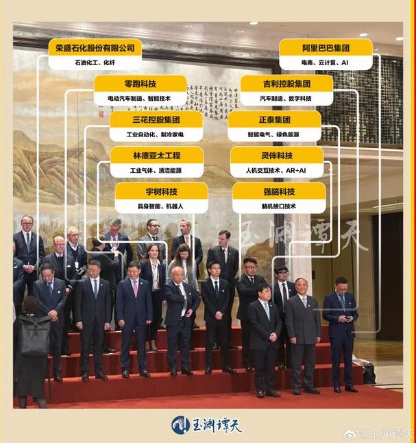 当天中午,默茨与随行代表团在杭州与当地企业家的午宴合影信息量很大。据“玉渊谭天”,参与合影的10家中方企业分别是:正泰集团、吉利控股集团、阿里巴巴集团、荣盛石化股份有限公司、三花控股集团、零跑科技、林德亚太工程、宇树科技、强脑科技、灵伴科技。