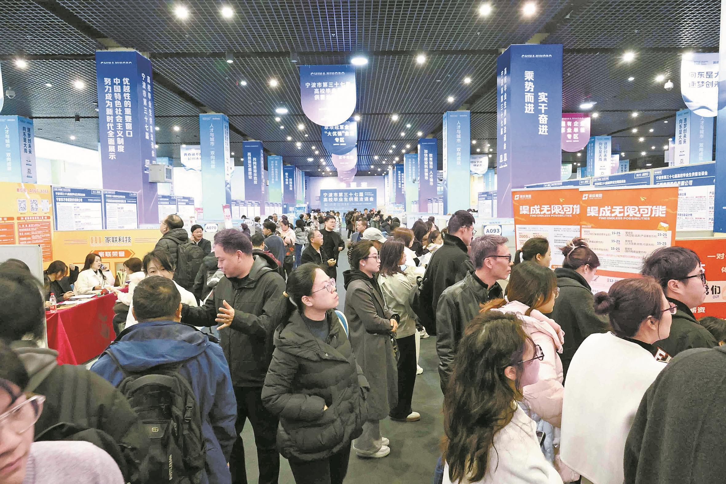 昨天,宁波市第三十七届高校毕业生供需洽谈会(简称毕洽会)在宁波人力资源大厦启幕。本届毕洽会为期两天,600多家企业入场招聘,岗位需求人数超1.4万,首日吸引3711人入场对接洽谈。(甬派客户端宁波日报 陈结生 摄)