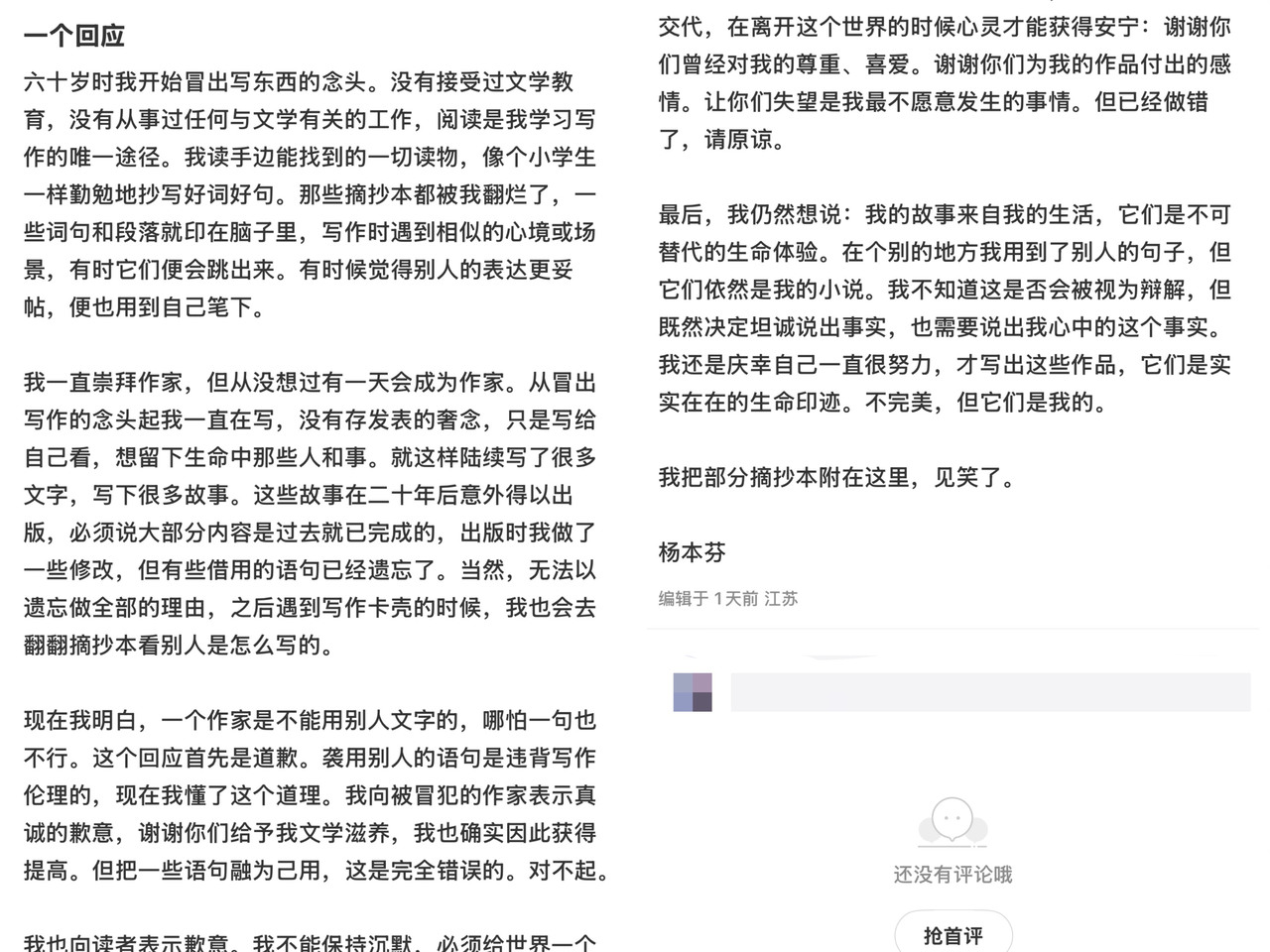 2月27日,杨本芬在其社交平台发表题为“一个回应”的长文公开道歉,承认“袭用”他人语句。