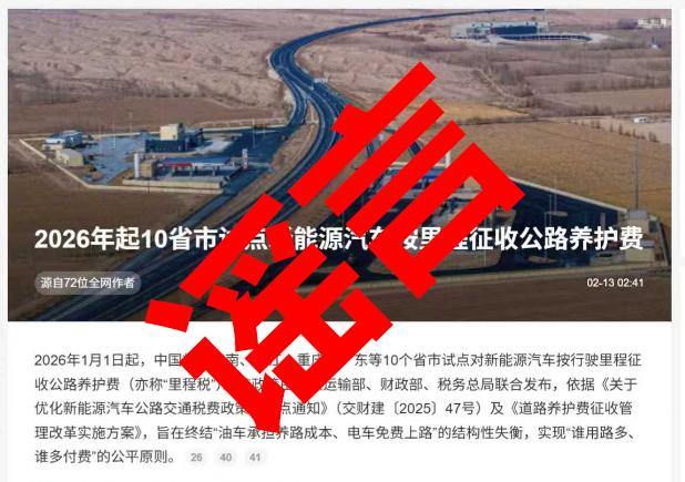 近日,社交媒体多个账号发布消息称,“国内10省市自2026年1月1日起试点开征新能源汽车公路养路费(又称‘里程税’)”,传言涵盖收费标准与代扣方式,引发消费者和车主的关注。