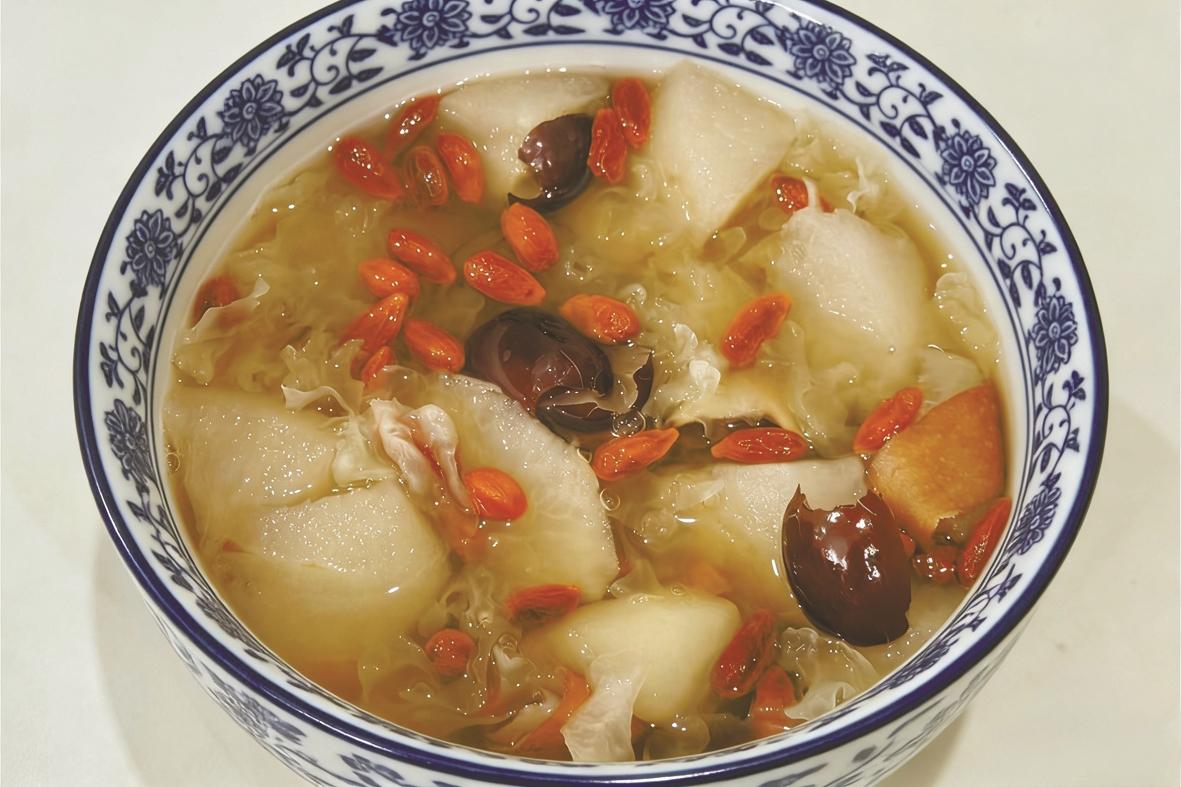 做炖梨盅时,讲究的是耐心。“嚓嚓嚓”挖去梨核,放入泡发的白木耳、红枣,添一小把枸杞和少许冰糖,梨盅内不加水,隔水蒸半小时——梨熟自会出汁,清甜全在盅里。出锅时,梨肉软糯,汤汁晶莹,趁热吃下,从喉头暖到心底。