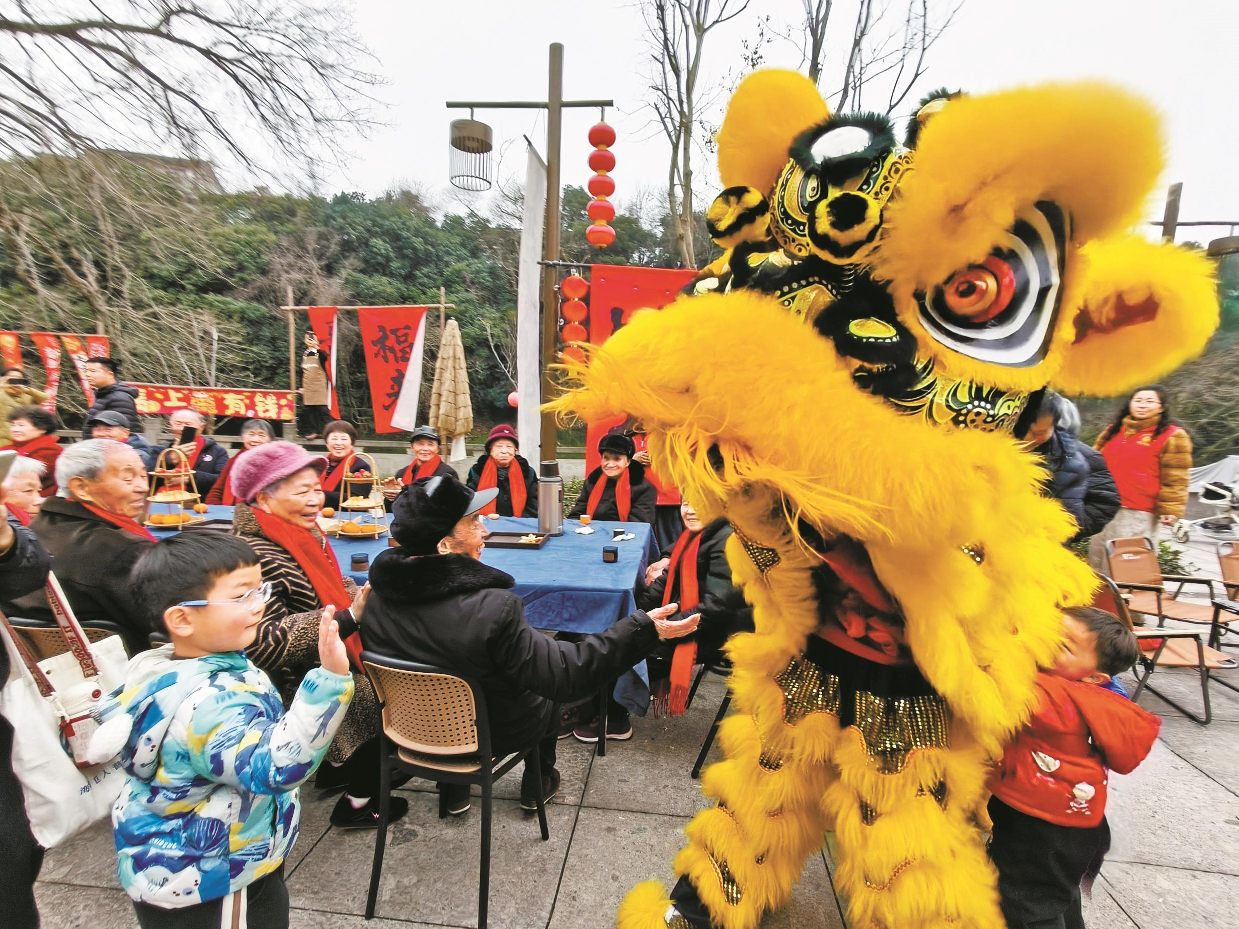 2月28日下午,它山堰畔暖意融融,“喜乐鄞江”元宵盛宴温情启幕。 悬慈村的20多位长者,受邀入席长寿宴,在茶香、点心香与欢声笑语中提前欢度元宵佳节。(甬派客户端宁波日报 王博 摄)