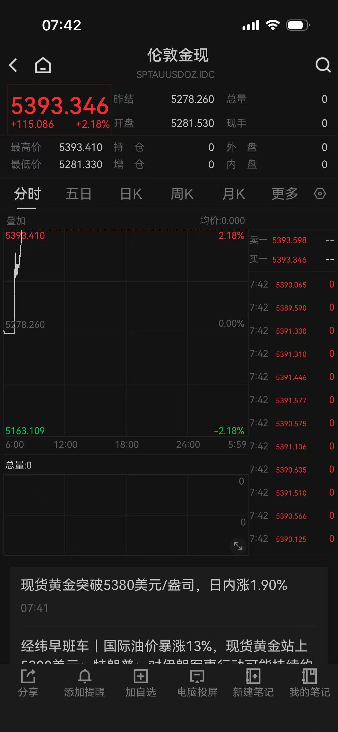 截至早上7点42分,现货黄金大涨2.18%,冲上5393美元/盎司。