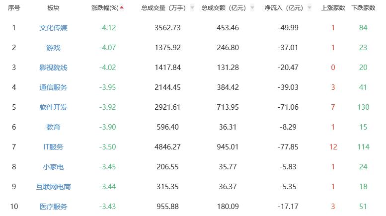 板块方面,油气开采及服务、贵金属、石油加工贸易等涨幅居前,文化传媒、游戏、影视院线等跌幅居前。