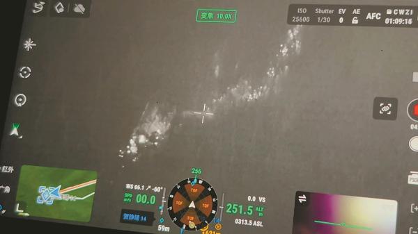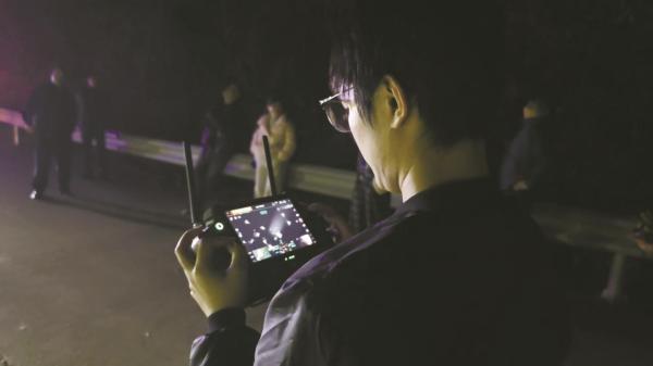 消防员到场后,与民警根据徐女士发来的定位信息,制定了“空地协同”搜救方案:一边由民警操控无人机升空,打开热成像仪向定位方向展开空中搜索;另一边,消防员携带照明设备,根据无人机指引及定位信息徒步登山搜寻。
