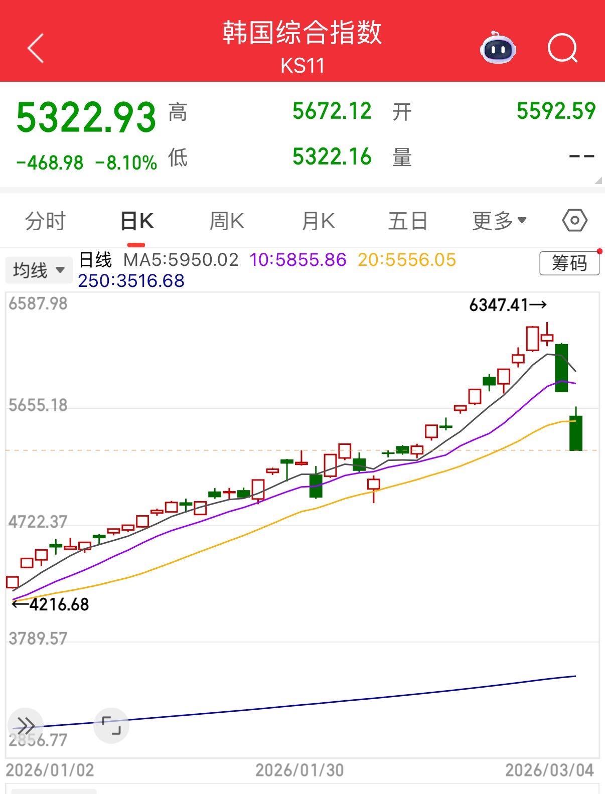 3月4日,韩国股市继续暴跌。韩国综指KOSPI暴跌8%再度触发熔断,交易暂停20分钟。