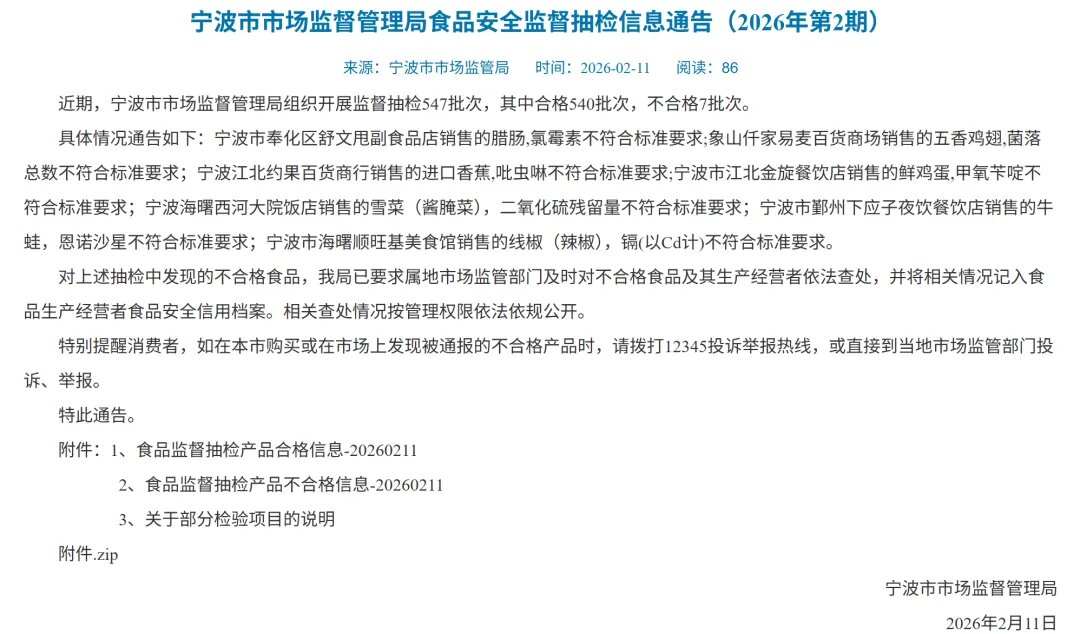 近期,宁波市市场监督管理局组织开展监督抽检547批次,其中合格540批次,不合格7批次。