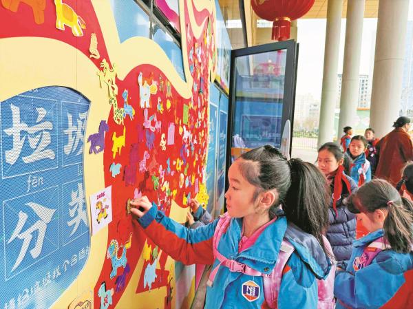 昨日,江北区外国语艺术学校小学部的孩子在“马年福气墙”贴自己剪的小马作品。(陈结生 宣佳含 摄)